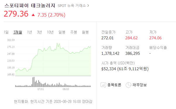 뉴욕 증권거래소에 종목명 SPOT로 등록되어 있으며, 현재 가격은 279불에 형성되어 있습니다. (8월 28일자)