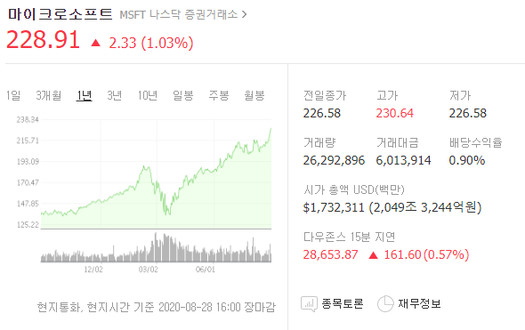 마이크로소프트는 나스닥 증권거래소에 상장되어 있으며, 8월 28일자 기준으로 228.91 달러에 거래되고 있습니다. (사상 최고가)