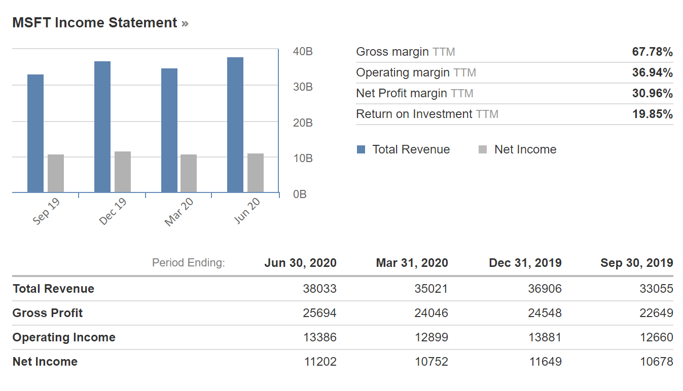 마이크로소프트는 아무래도 소프트웨어가 주력인 기업이므로 전통적인 제조업 등에 비해서 마진율이 꽤 높은 편입니다만 Net Profit Margin (순이익률)만 무려 30프로가 넘습니다.