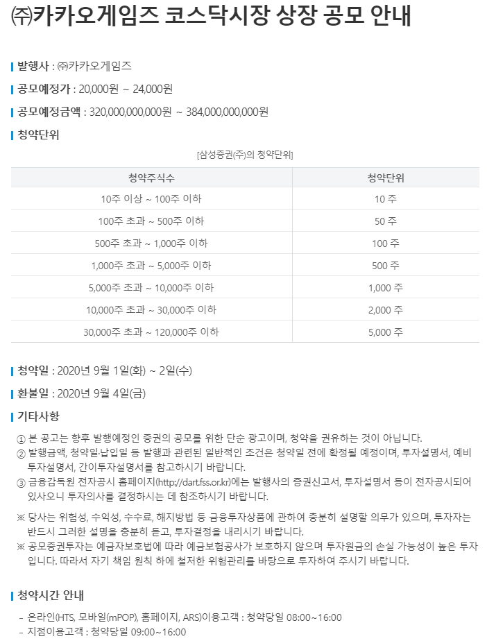 카카오 게임즈 공모주 청약은 한국투자증권 / 삼성증권 이 상장주관사로 참여하고 있고, 아래와 같이 홈페이지를 통해서 안내문을 게시하고 있습니다.