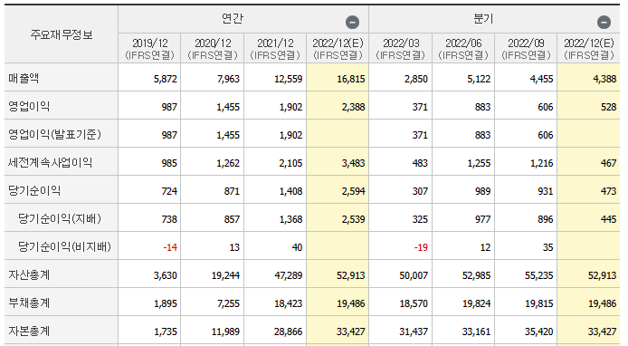 일단 기본적인 재무분석부터 진행해보면, 2019년부터 2022년까지 3배가 넘게 매출이 성장한 것을 볼 수 있습니다. 그에 맞게 영업이익도 2배가 넘게 올라간 부분이 보이고요. 자산과 부채도 기하급수적으로 오르는 모습이 보입니다만, 기본적으로 성장성이 어마어마하다는 것이죠.