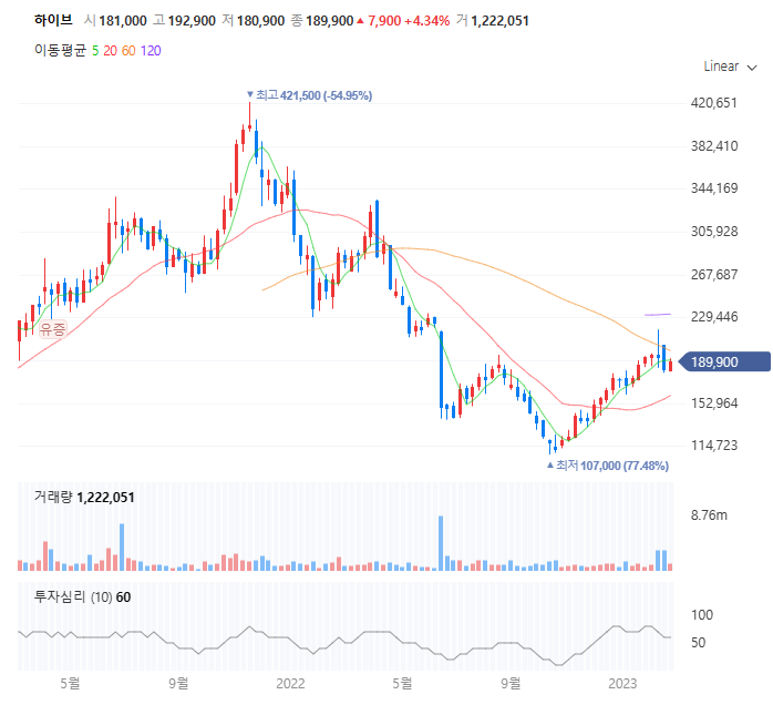아무래도 주식이 하락한 원인에는 여러가지가 있겠습니다만 BTS 군입대로 인한 매출공백 등이 우려되었기 때문이 아닐까 하네요. 하지만 작년 여름에 데뷔한 뉴진스가 어마어마한 인기를 거두면서 하드캐리하고 있는 상황이어서 이에 대한 기대감에 다시 주가가 상승으로 방향을 전환한 것으로 보입니다.